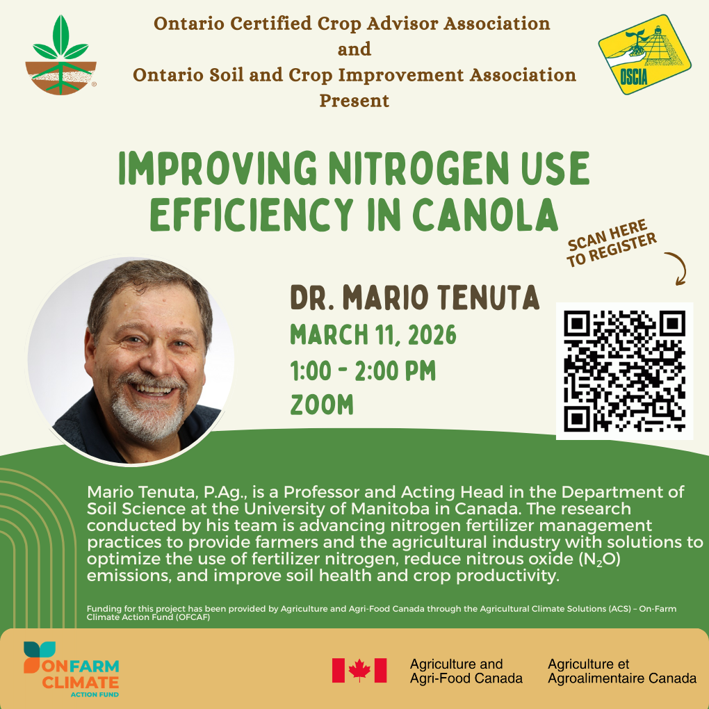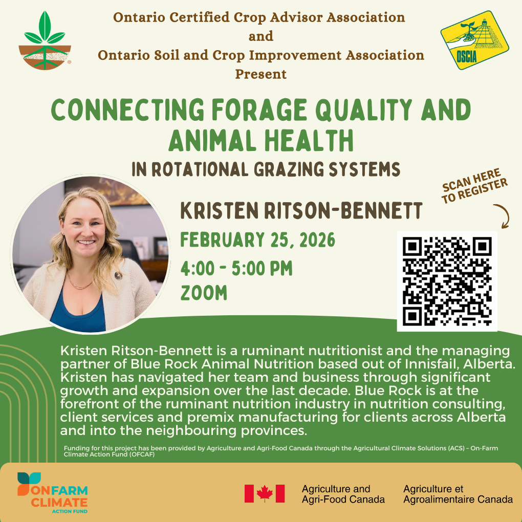 The Ontario Certified Crop Advisor Association (CCA) and Ontario Soil and Crop Improvement Association (OSCIA) have partnered to deliver training and educational resources to Ontario agrologists. With a focus on cover crops, nitrogen management, and rotational grazing, these sessions will support the objectives of the On-Farm Climate Action Fund.